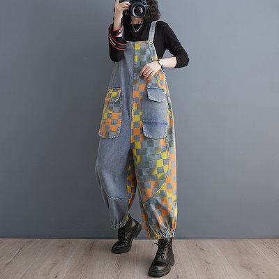 2024春 新作 コントラストカラー ポケット 束口 デニムサロペット オーバーオール レディース オールインワンパンツ