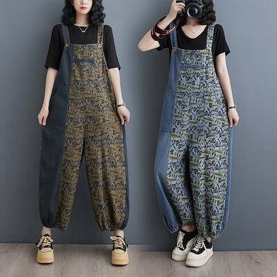 2024春夏 新作 ゆったり 大きめ レトロ 花柄 オールインワンパンツ 着痩せ デニムサロペット レディース オーバーオール