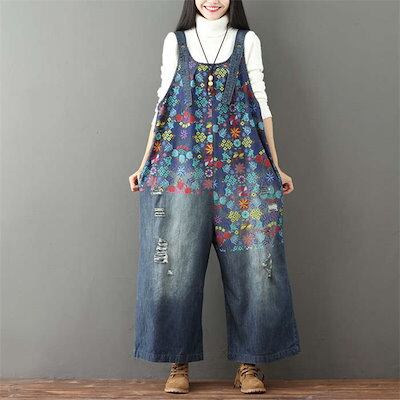 オールインワン デニム サロペット レディース オーバーオール ワイドパンツ デニムパンツ ダメージデニム おしゃれ 可愛い 花柄 プリント エスニック ボトムス パンツ 体型カバー オールシーズン