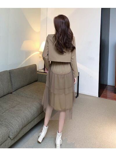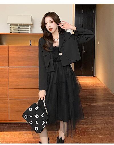 2色 セットアップ ジャケット クロップ丈 長袖 レイヤード ショート ひざ丈 ワンピース レディース シャーリング ギャザー キャミワンピース チュール ティアード セクシー 大人可愛い おしゃれ