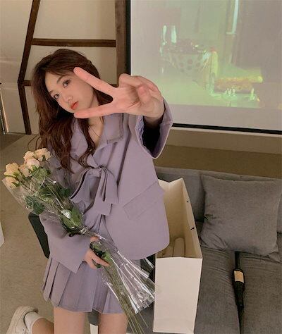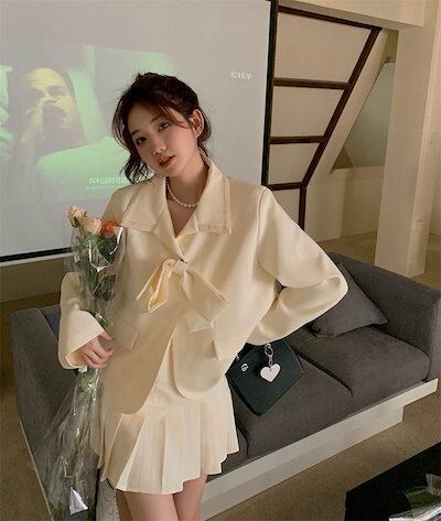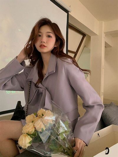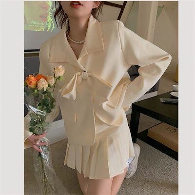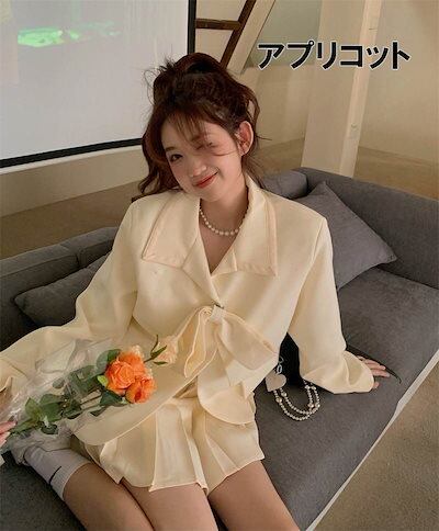 2色 セットアップ レディース スカート アプリコット パープル アウター ジャケット 2点セット ツーピース 上下セット コート ジャケットスーツ 上着 スカート ミニ プリーツ リボン 長袖 萌袖