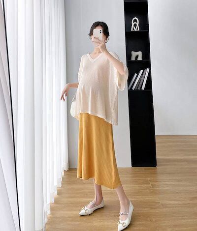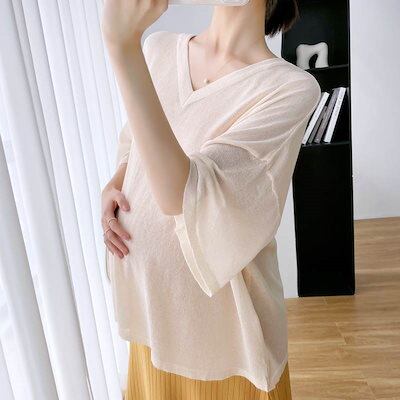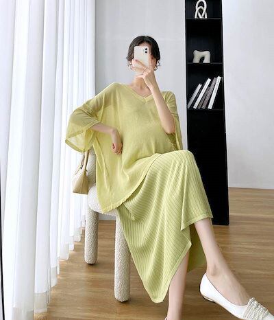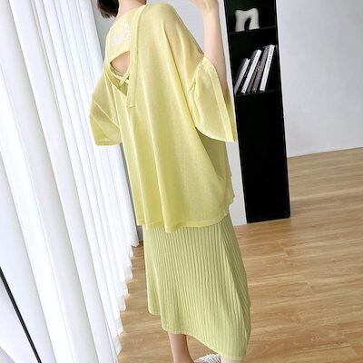 セットアップ レディース マタニティ 大きいサイズ ワンピース Tシャツ 七分袖 シアー 透け感 バックコンシャス バックオープン Vネック タンクトップ フレアワンピース 2点セット ツーピース タ