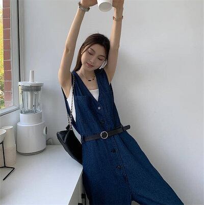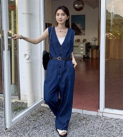パンツ サロペット レディース デニム オーバーオール ワイド ボタン vネック レイヤード サロペットパンツ ワイドパンツ 大きいサイズ カジュアル シンプル 定番 大人 ナチュラル ロールアップ