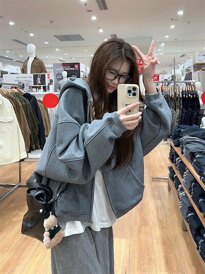 2024 秋冬 韓国 かわいい レディース 無地 フード付き長袖アウターレトロセット黑白フーディーブルサイズ丈トップス春カジュアルスポーツファッション系通学学生袖お出かけアップシルエットトラック羽織り
