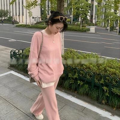 アップ レディース 秋冬 ニットセーター ワイドパンツ オーバー 上下 通勤 カジュアル 長袖 ゆったり 厚手 クールネック お洒落