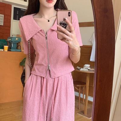 2024新作 セットアップ カジュアルなスポーツスーツ夏に着て痩せる減齢コート半袖ワイドパンツの2着 百掛け 韓国ファッション 涼しく楽ちんセットアップ ルームウェア セットアップ レディース 夏 韓