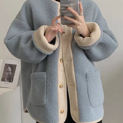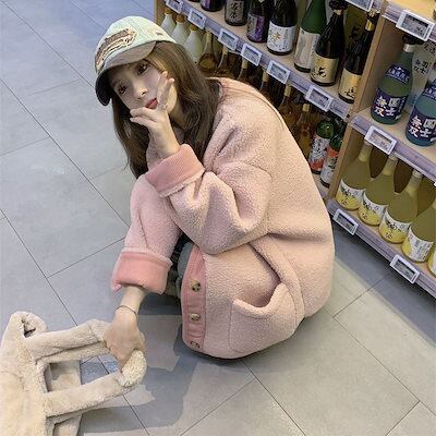 日韓国ファッション 冬アウター フェイクラムズフリース ファーコート レディース ショートコート レトロ 高級感 中綿コート カーディガン 百掛け 着痩せ ジャケット
