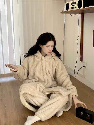 秋冬 暖かいコーラルフリース ふわふわパジャマ レディース 可愛い着ぐるみパジャマ フード付きネグリジェ/ズボン 二点セット 裹起毛ルームウェア セットアップ 韓国ファッション 部屋着 フランネル