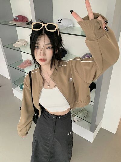 2024秋韓国かわいいレディースアウターブルゾンお出かけブラックライトカーキアウター長袖セクシートップスサイド冬カジュアルファッションお出かけフル丈