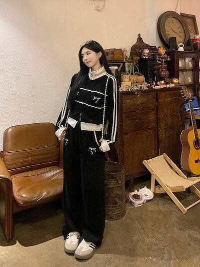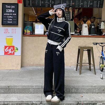 2024秋上下2点セットトップスお出かけ韓国羽織りショート丈フルラウンドヘムサイズ丈ボトムスストレート冬ゆったりレディースシルエットスタイルアップワイドお出かけ