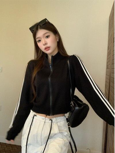 2024秋韓国かわいいニットネックレディースアウターブルゾンお出かけブラックライトカーキアウター長袖セクシートップスサイド冬カジュアルファッションお出かけフル丈