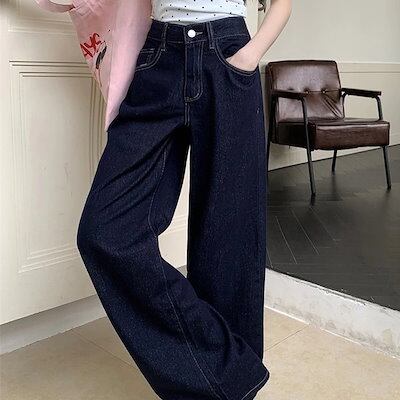24パンツ ロング丈 デニム ジーンズ ワイド ストレート ハイウエスト 美脚効果 脚長効果 細見え レトロ インディゴブルー 韓国ファッション レディース かわいい おしゃれ カジュアル