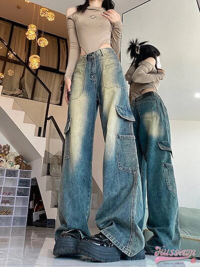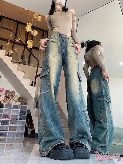 24パンツ デニム ジーンズ ワイド ストレート ハイウエスト 脚長効果 美脚効果 細見え ウォッシュ ポケット カジュアル 韓国ファッション レディース お出かけ