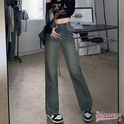 ハイウエストストレートジーンズ レディース ストレートロングパンツ カジュアル 可愛い シンプル30%までに制限