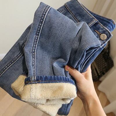 あたたまること 子羊の毛 着痩せ ハイウェスト 裏起毛 厚手 ストレート ブルー ロングズボン レディース が引く