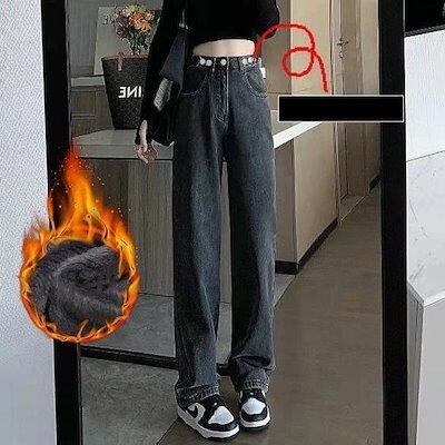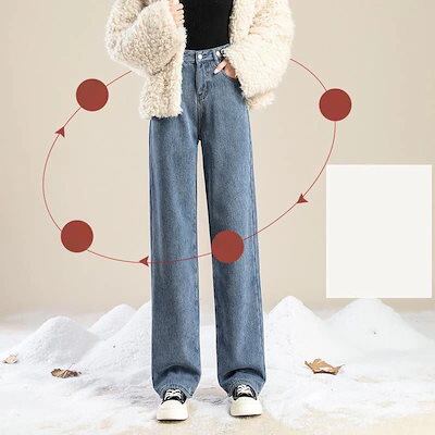 レトロ 裏起毛 ジーンズ レディース ストレート ゆったり 厚手 ハイウェスト 着痩せ ラージコード ワイドパンツ