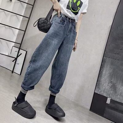 裏起毛 厚手 ニューデザイン デニムボトムス ハーレムパンツ レディース ラージコード ハイウェスト 着痩せ ストレートパンツ