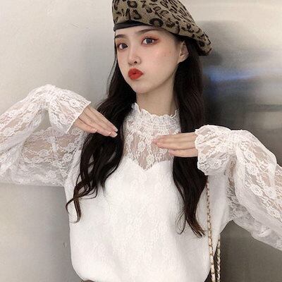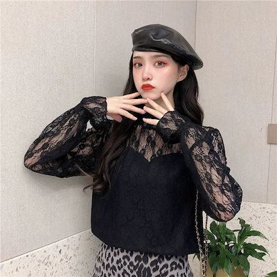 2色 裏起毛レーストップス シースルー レディース 繊細レース 見せるインナー 長袖 アンダーウェア 着痩せ