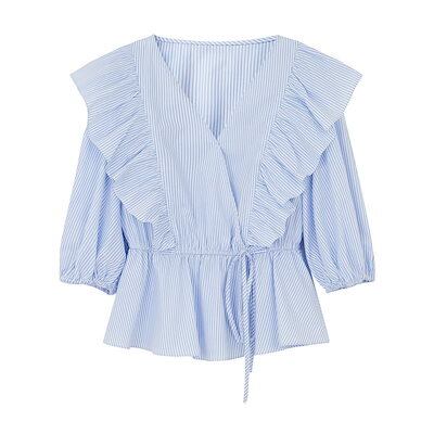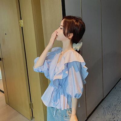 今っぽシアーシャツ レディース半袖Vネックシャツ ストライプシャツ 体型カバーチュニックショット丈長袖ブラウス