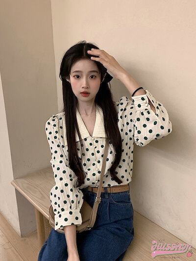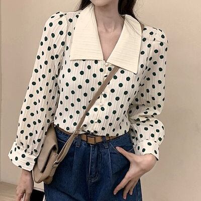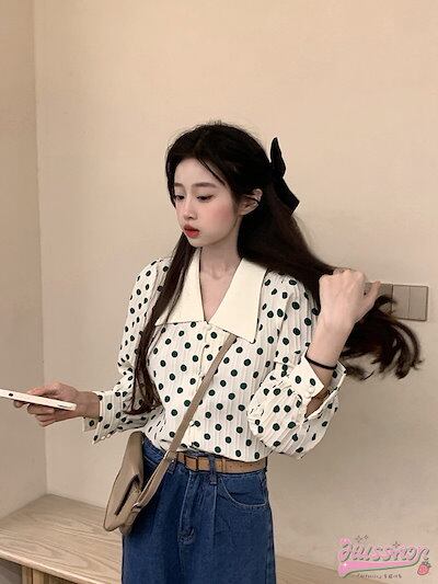 2024 春夏トップス シャツ 長袖 バブル袖 ドット柄 Vネック 襟 ボタン 春 白 ホワイト かわいい キュート ガーリー 甘め おしゃれ 韓国ファッション レディース お出かけ