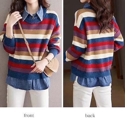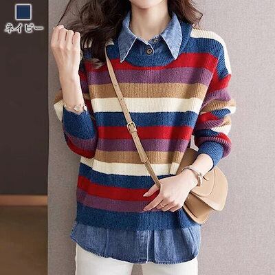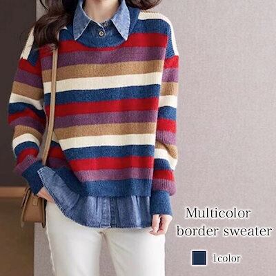 セーター レディース マルチカラーボーダーセーター タートルネック ゆる ざっくり かわいい 厚手 ケーブル編み トレーナー 人気 白 黒 ブランド 柄 ハイネック ニットセーター 春 クルーネック