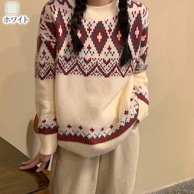 セーター レディース ノルディック柄ニット ロング おしゃれ トレーナー ニットセーター 黒 ゆる 春 ざっくり 人気 Vネック ニット 厚手 ハイネック 洗える 柄 タートルネック ふわふわ ノルデ