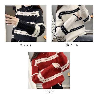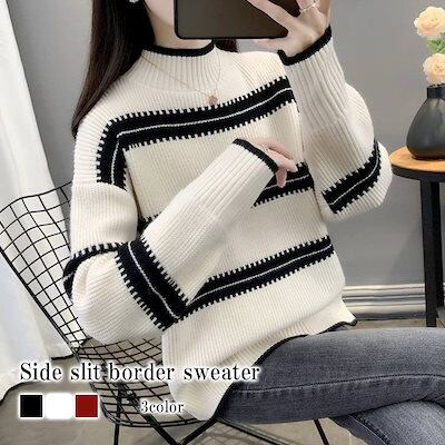セーター レディース サイドスリットボーダーセーター タートルネック ゆる ざっくり かわいい 厚手 ケーブル編み トレーナー 人気 白 黒 ブランド 柄 ハイネック ニットセーター 春 クルーネック