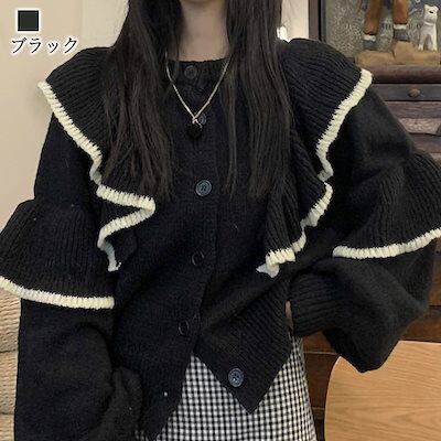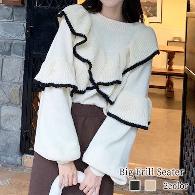 セーター レディース ビッグフリルセーター タートルネック ゆる ざっくり かわいい 厚手 ケーブル編み トレーナー 人気 白 黒 ブランド 柄 ハイネック ニットセーター 春 クルーネック おしゃれ