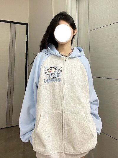 クレヨンしんちゃん フード付きスウェットシャツ レディース ゆったり レイジー ラグランスリーブ ジッパー トップス