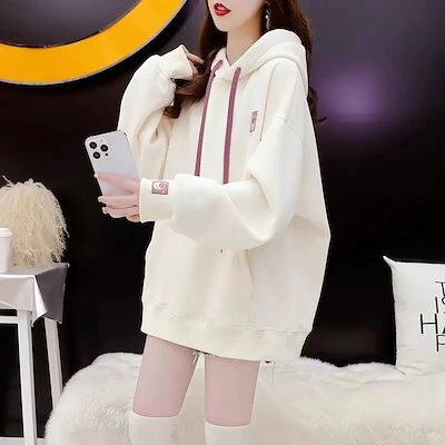 本日の限定商品韓国 パーカー 百掛け コントラストカラー スウェット ゆったり大人 パーカー フード付き ロング スウェット レディース ルーズ 大きいサイズ トップスメガ割