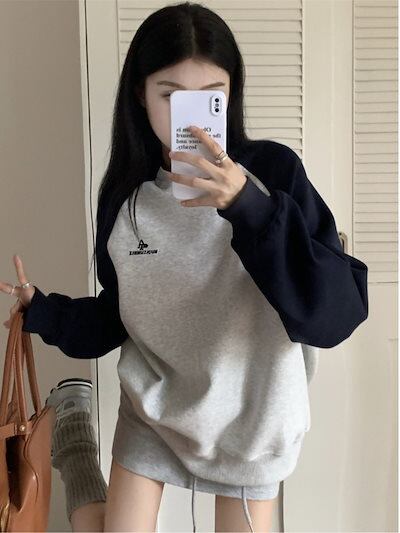 韓国 パーカー 刺繍 色の衝突 スウェット レディース 秋 カジュアル ルーズ トップス