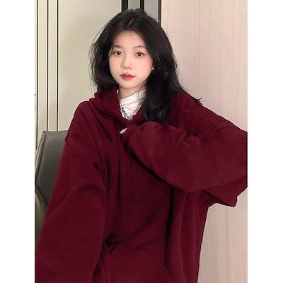 韓国 パーカー 潮レトロなワインレッドの文字がプリントされたセーター 2024新しい秋と冬のジップカーディガンジャケットインス