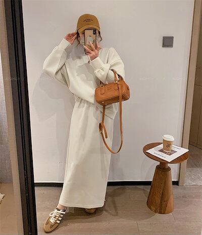 秋冬 気質 セットアップ レディース セット 裏起毛 スウェット+ニットスカート ロング カジュアル シンプル 無地 着痩せ 高級感 人気 韓国ファッション レディース 防寒 暖かい