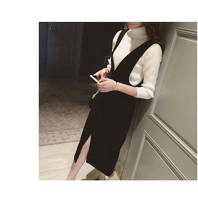 ニットワンピース セットアップ レディース 秋冬 きれいめ ジャンパースカート 膝丈ワンピース 40代 vネック スリットスカート サロペット ワンピ 2点セット