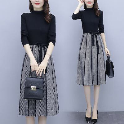 【期間限定メガ割】レディースニットワンピース レディース 20代 30代40代 春秋冬 きれいめ 膝丈ワンピース 長袖 リボン Aラインプリーツスカート ニット 結婚式ドレス 通勤 ロング 着痩せ