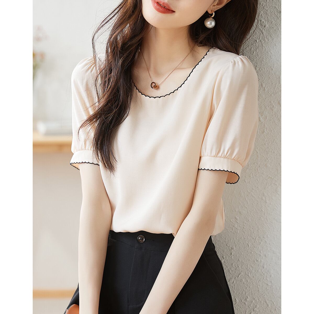 初回送料無料トップシフォンシャツ半袖パフスリーブラウンドネックレディーストップス