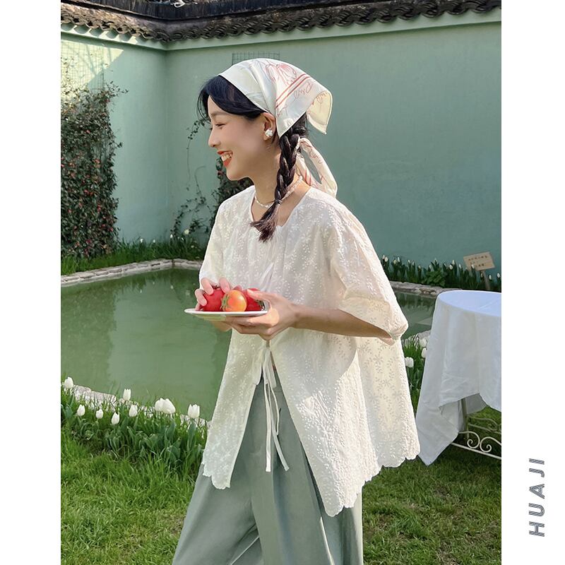 初回送料無料刺?レディースファショントップス人気花刺??半袖シャツレースアップ