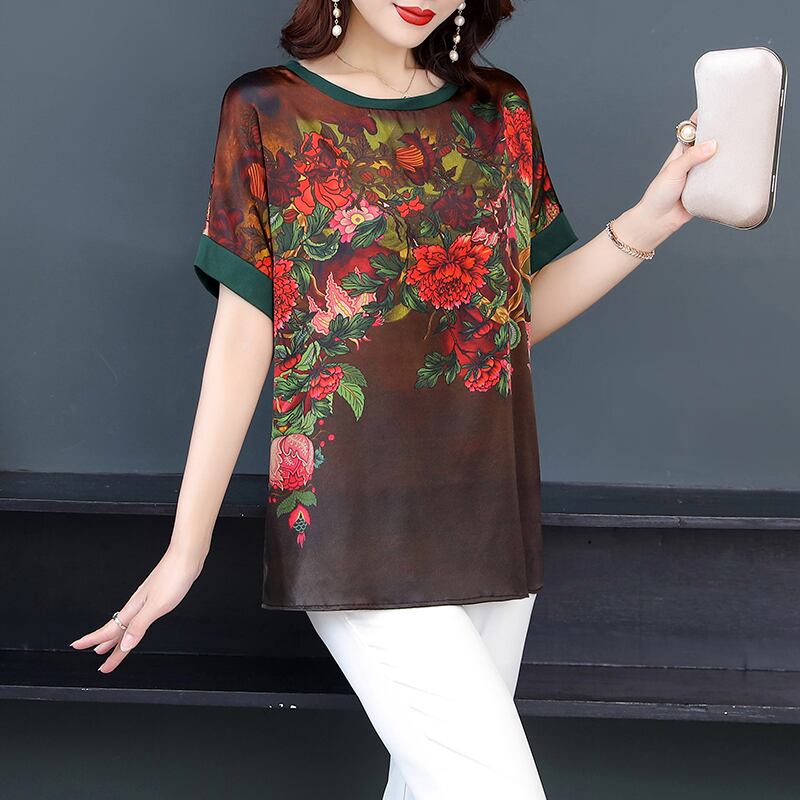 初回送料無料ラウンドネック半袖シルクゆったりサイズシャツトップサマートップスブラウス