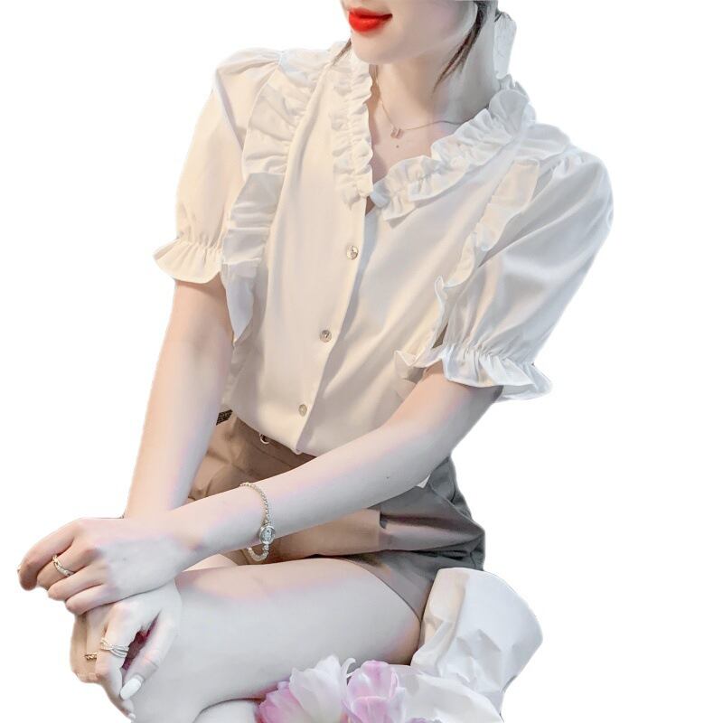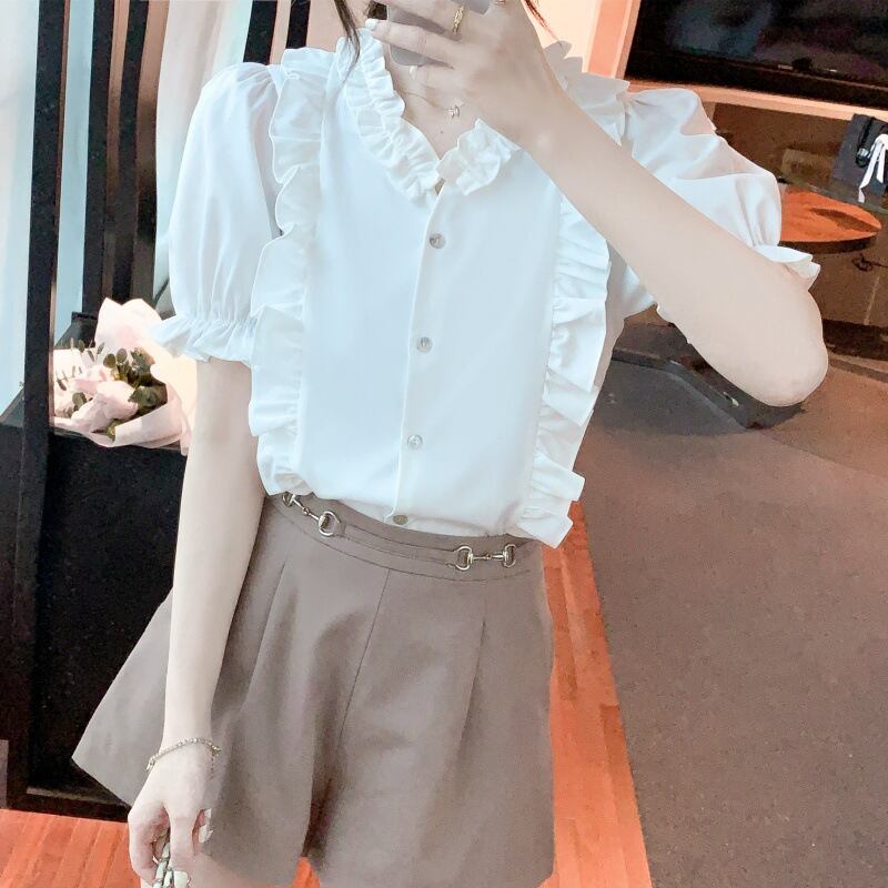 初回送料無料半袖シャツシフォンVネックフリルレディースファショントップス人気商品