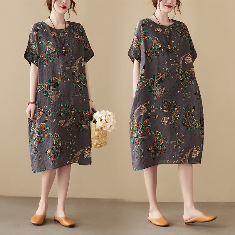 初回送料無料夏新作トップスワンピース コットンリネンドレス半袖レトロ