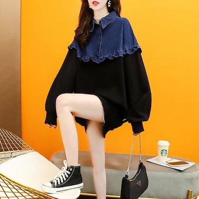 ゆったりスウェットパ一力一秋スウェット デニムパッチワークゆったりパーカー レディース 韓国ファッション 百掛けスウェット 長袖トップス
