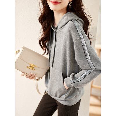 コットン フード付き スウェット レディース 春秋 キラキラ ファッション カジュアル 長袖ブラウス トップス