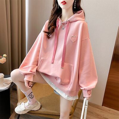 韓国 デザイン感 ハート 長袖 スウェット レディース 秋冬 ゆったり トップス フード付き