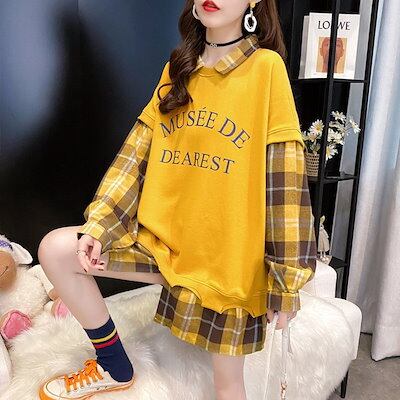 原宿系 長袖 レディース 韓国ファッション トップス トレーナー ロンT 長袖 重ね着風 原宿 ストリート グリッドパターン 春秋 カップル 男女兼用