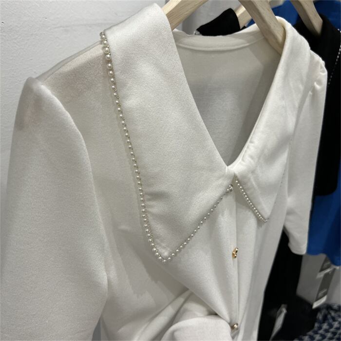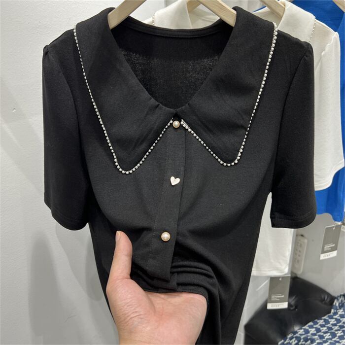 激安セール シン/パール/ラペル/半袖/Tシャツ/女性/2022/夏/新作/スウィート/Tシャツ/トップス