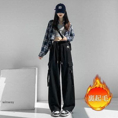 カーゴパンツ レディース 裏起毛 ワークパンツ ハイウエスト 秋冬 ロング ダンスパンツ ボトムス カーゴ カジュアル ゆったり 着痩せ おしゃれ