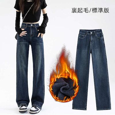 レディース デニムパンツ 裏起毛 弾力 ゆったり ワイドパンツ 厚手 ドレープ感 ワイドパンツ 保温 ハイウェスト 着痩せ デニムボトムス