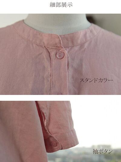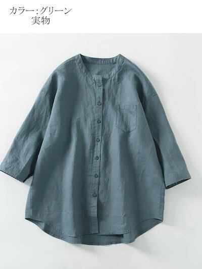 シャツブラウスレディース春夏シャツ春物ブラウス七分袖前開きバックギャザー体型カバースタンドカラー羽織り袖ボタン前後差裾フレアラウンドヘーム無地クルーネックきれいめゆったり柔らかトップスシンプルお洒落2