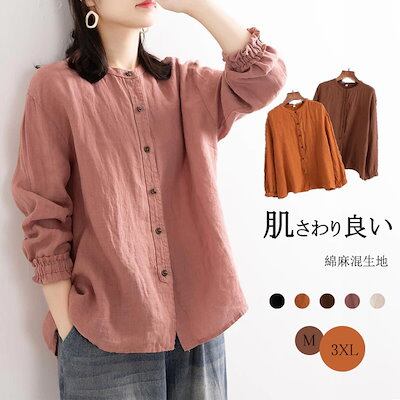 フリル襟シャツレディース長袖ふんわり柔らかい綿麻肌触り良いカジュアル長袖シャツ前開きボタン留め羽織綿カジュアルシャツお洒落全開重ね着綿シャツバンドカラーフリル袖通気性無地ゆるめ大きいサイズ