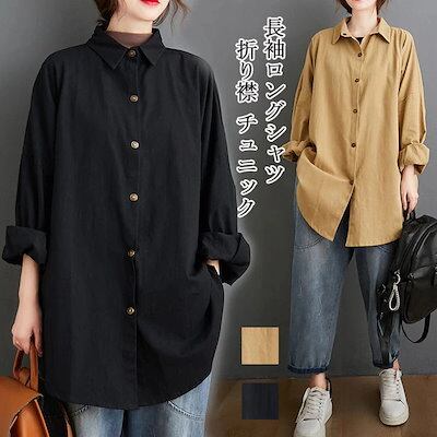 チュニック レディース 綿 長袖 ロングシャツ 折り襟 パフスリーブ シャツ 前開き ボタン 無地 コットン 綿混 トップス 羽織り 長袖シャツ ゆったり 体型カバー シンプル カジュアル シャツブラ